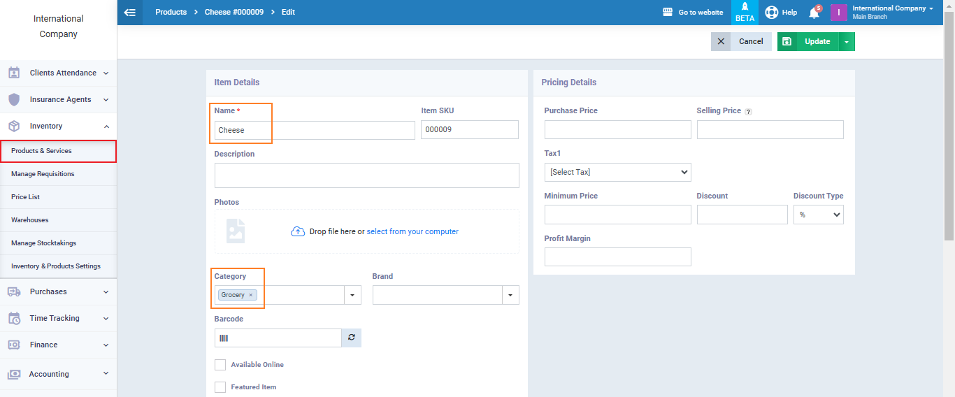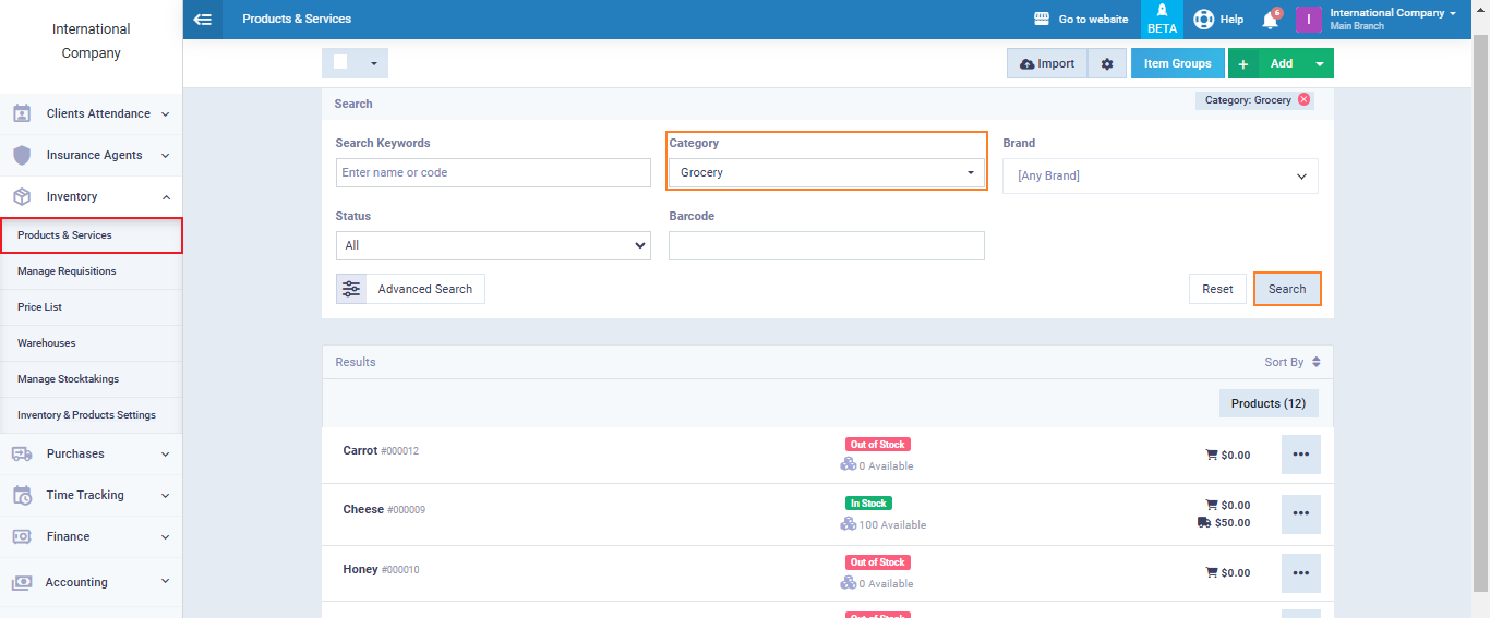 You can find all the products belonging to a specific category by clicking on “Products and Services” from the dropdown menu under “Inventory” in the main menu.