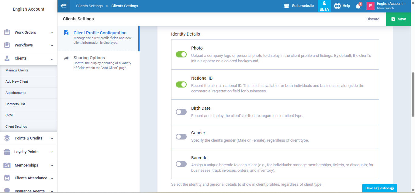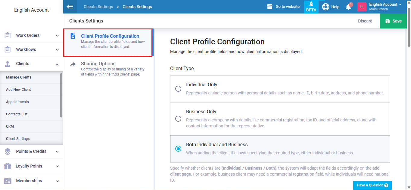 Client profile configuration settings give you full control over the data displayed in Client profiles and allow you to define suitable fields based on the Client type and your business activity.