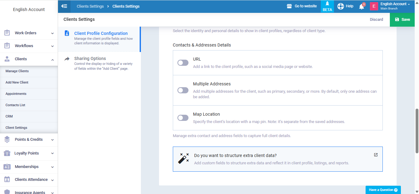 Client settings in the system help you manage client permissions, personal profile data, follow-up statuses, and other details. client settings are divided into: