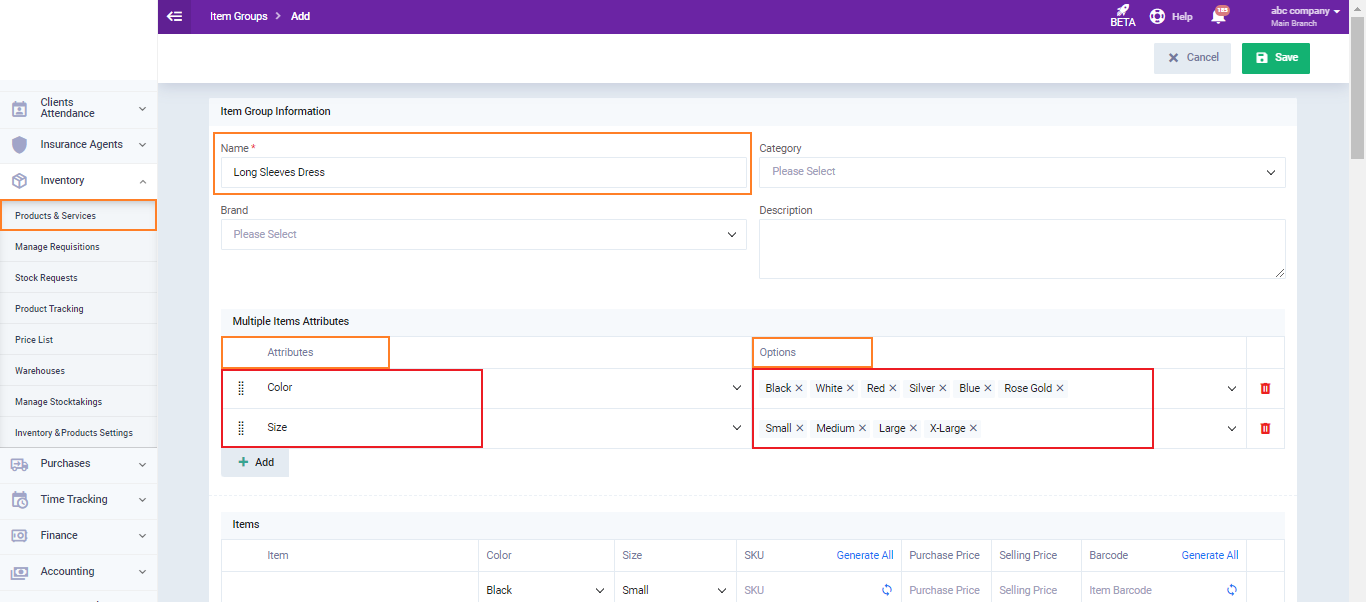 The item groups feature in the system helps you add different attributes to a single product, such as multiple colors, sizes, or dimensions. You can print these attributes with each product on its barcode label for easy identification. Below, we outline the simple steps to print product barcodes that include color, size, dimension, or other product attributes.