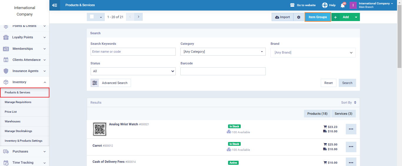You can add a new item group by clicking on “Products and Services” under “Inventory” in the main menu, then clicking on the “Item Groups” button, and finally clicking the “+ Add Item Group” button.