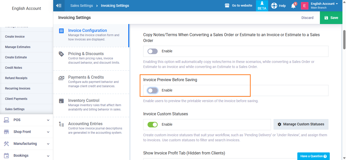 However, by disabling this option, the ability to preview the invoice before saving will be deactivated for all users, including the account admin.