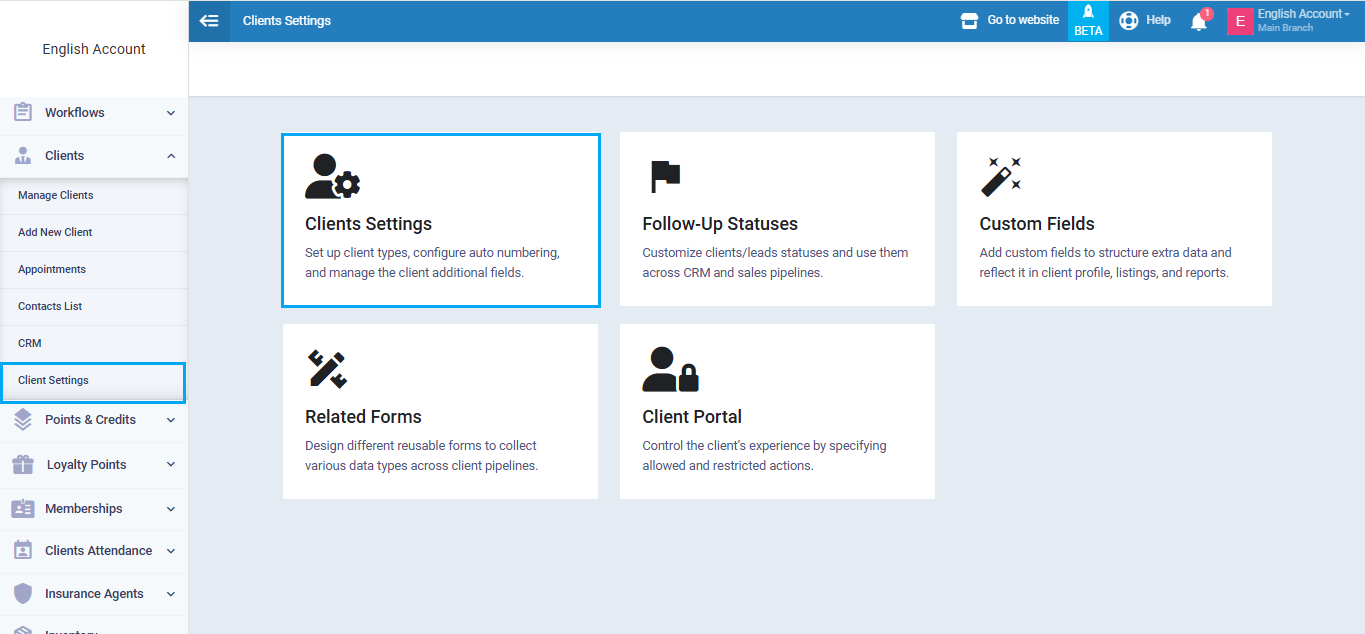 From the main menu, go to “Clients”, open the “Client Settings” dropdown, then click the “Clients Settings” card.