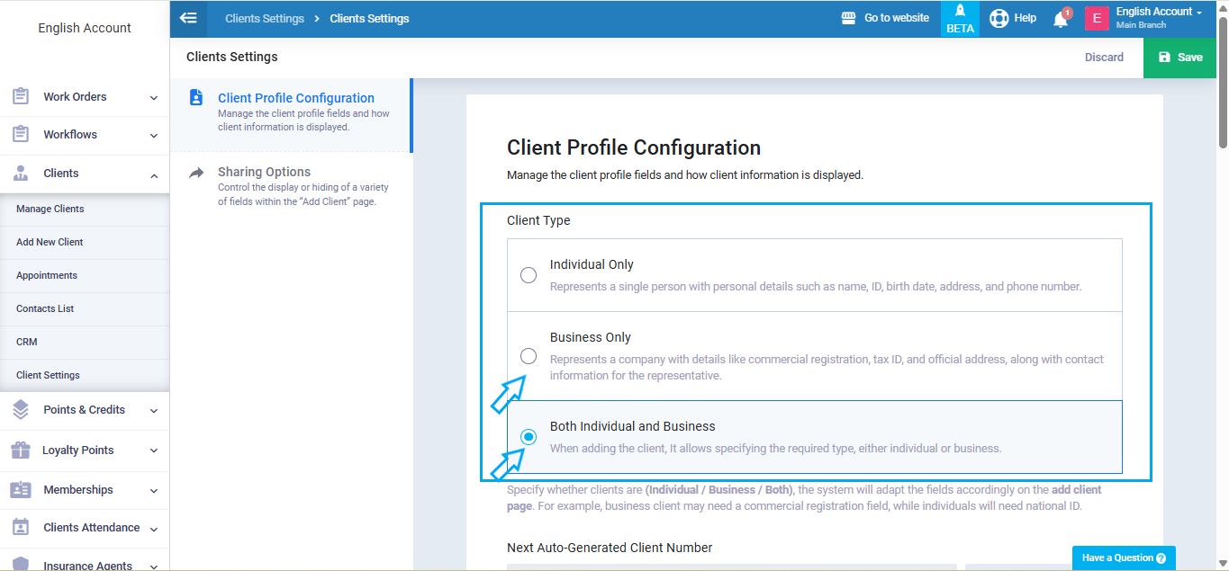 When adding a new Client or editing an existing Client profile, select Business as the Client type.