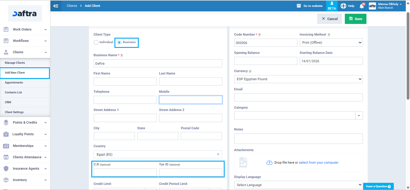 Set the Client Type to “Business Only” or “Both Individual & Business”, as the tax number and commercial registration do not appear for Individual Clients.