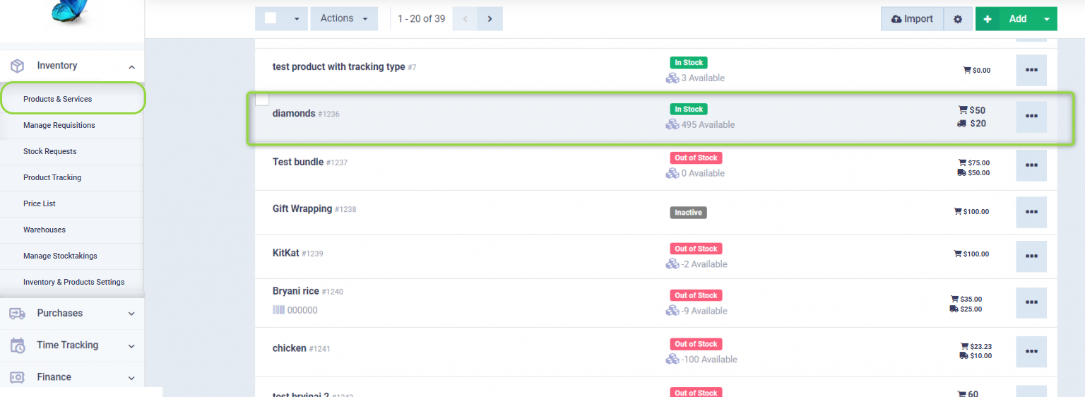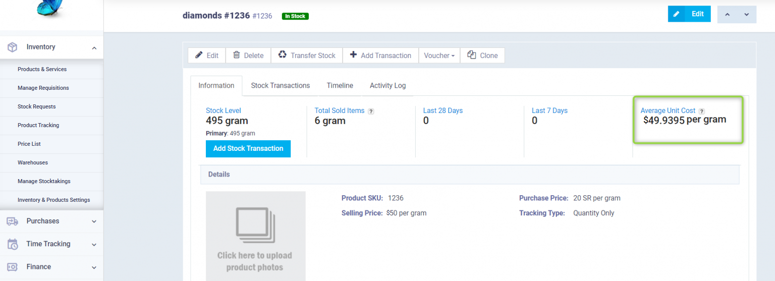 Click on “Products & Services” from the dropdown menu under “Inventory” in the main menu. Then click on the product for which you wish to review the average cost price.