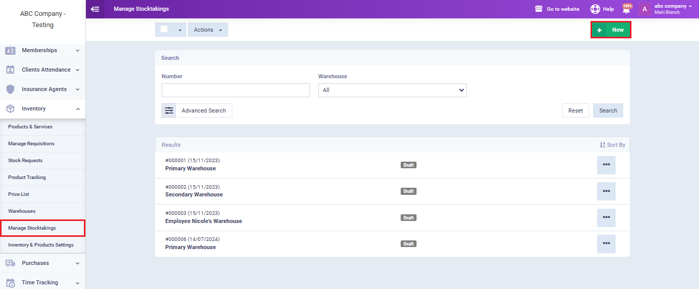 Click on “Manage Stocktaking” under the “Inventory” dropdown in the main menu. Then, click on the “New” button to create a new stocktaking sheet.