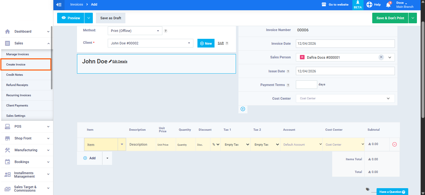 - Click on “Sales” from the main menu and select “Create Invoice.“