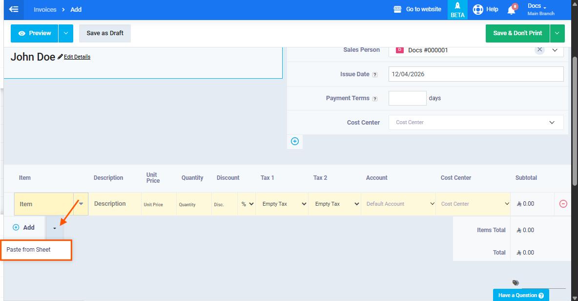 As shown in the previous invoice screen, we have selected the client “John Doe.” In the second step, we will add invoice items by copying their data from the Excel file.