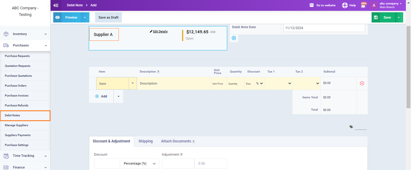 • Click on “Purchases” from the main menu, then click on “Debit Notes,” and then click the “Add Purchase Debit Note” button.