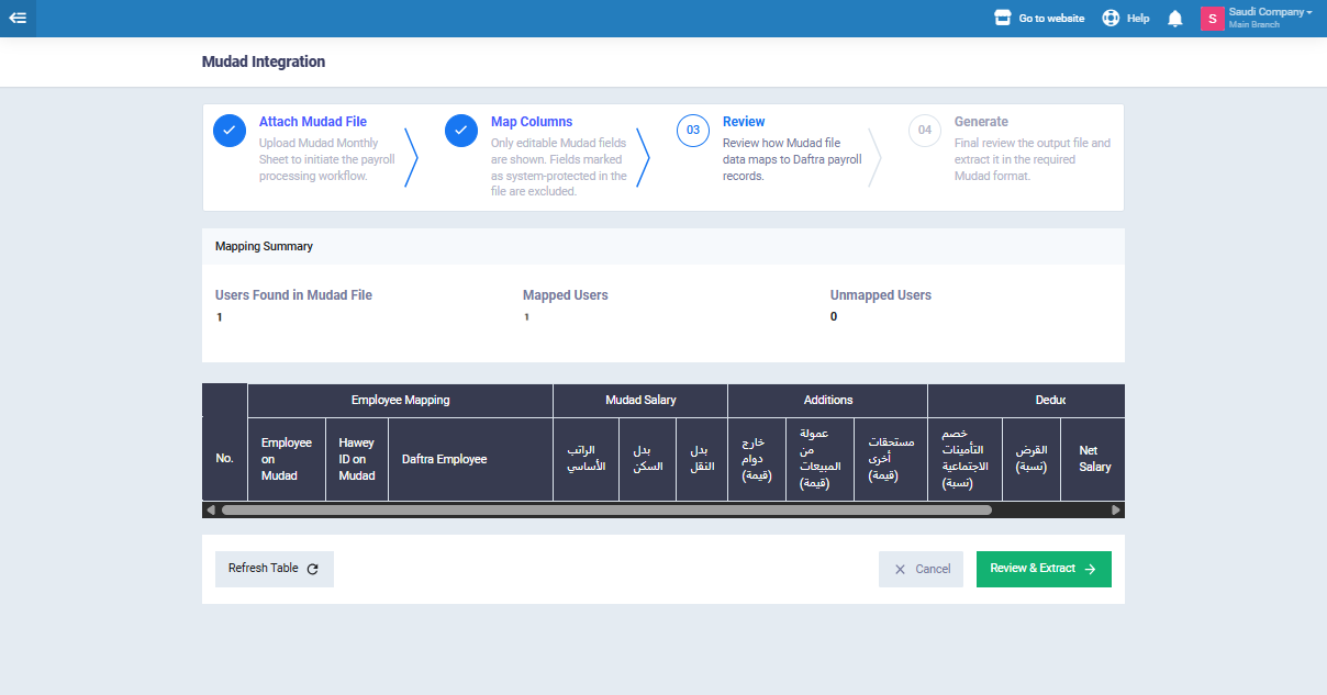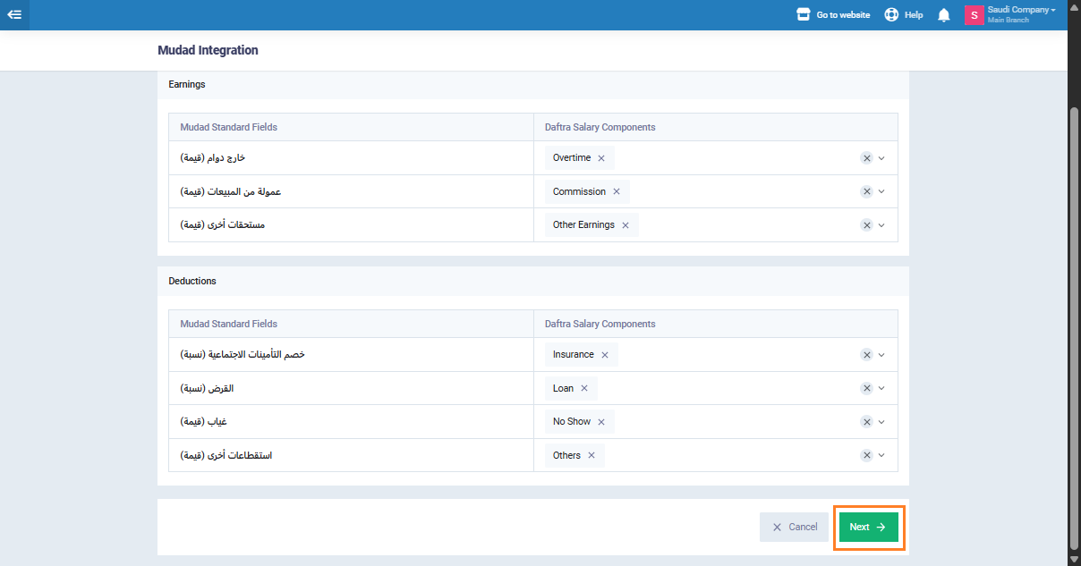 Transportation: Select the salary component for transportation allowance and map it to the “Transportation Allowance” field in Mudad.