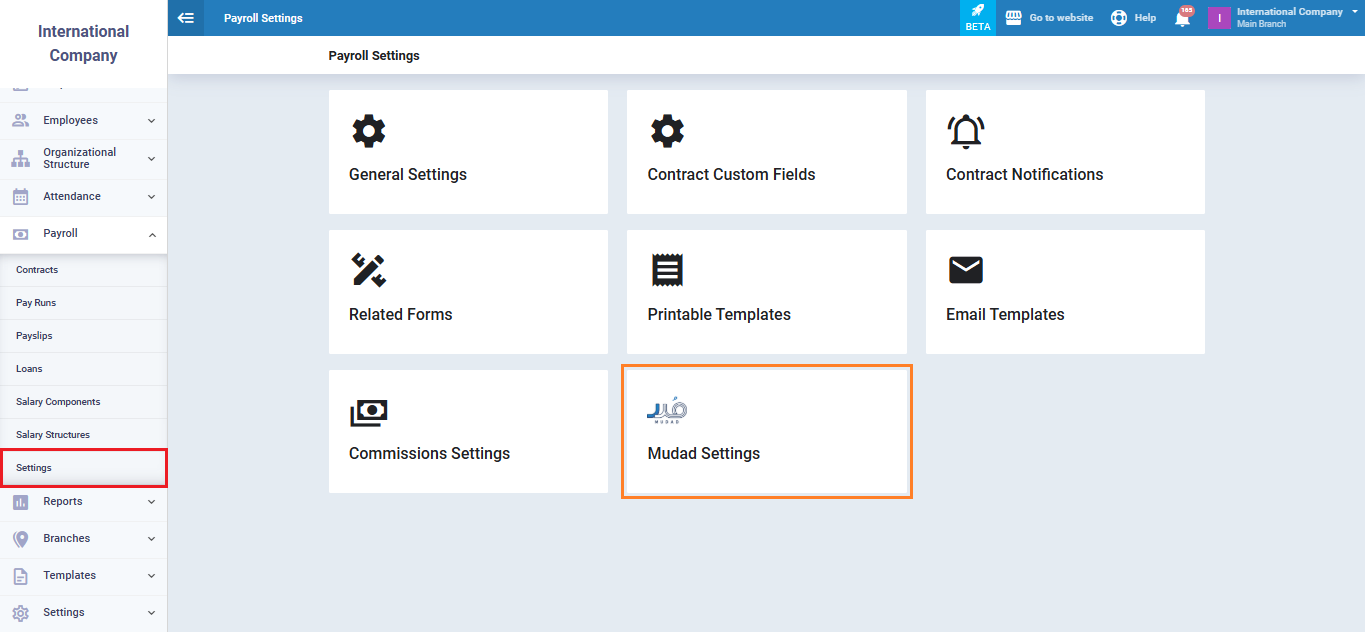 Go to “Payroll”, then from the dropdown choose “Settings“, and click on “Mudad Settings”