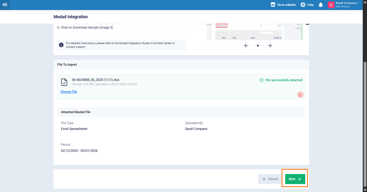 - Click “Download Final File“.The file will be downloaded in Excel format, fully prepared and compliant for direct upload to the Mudad platform.