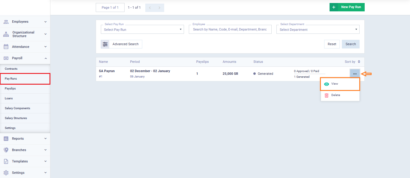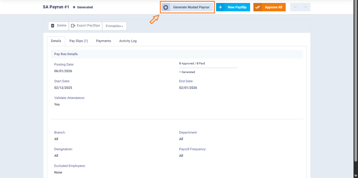 - From the “Pay Runs” screen in the system, open the pay run for which you want to generate the Mudad payroll file.
