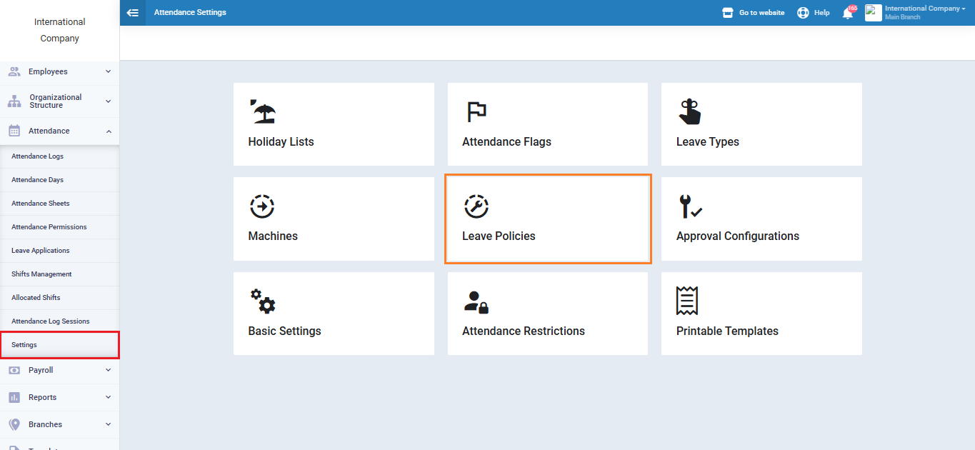 Click on “Settings” dropdown under “Attendance” in the main menu, then click on “Leave Policies”.