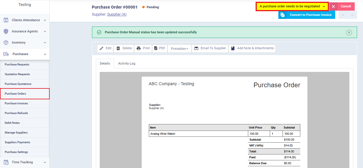 Here, you can see the difference in the types of manual statuses given to purchase orders compared to those given to purchase invoices based on the manual statuses you added for each type of purchasing document.