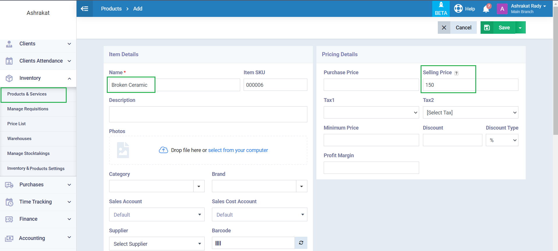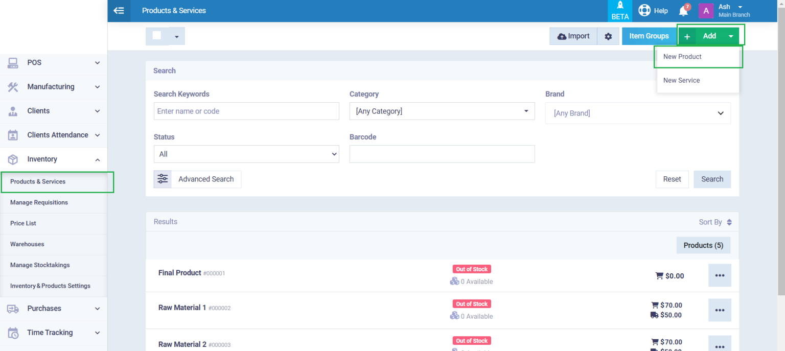 To add a new scrap to your inventory, click “Products & Services” under “Inventory” in the main menu. Then, click the “Add” button and select “New Product” from the dropdown menu.