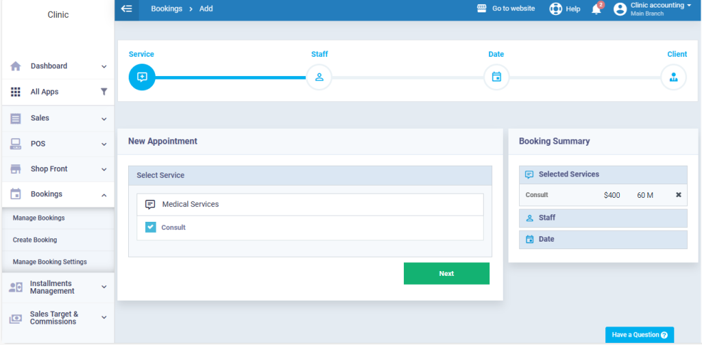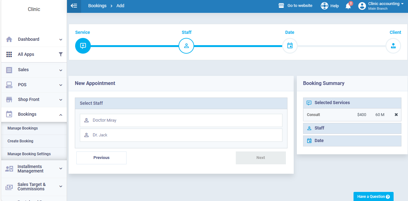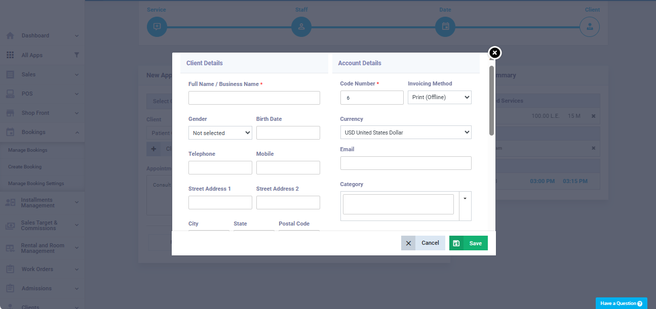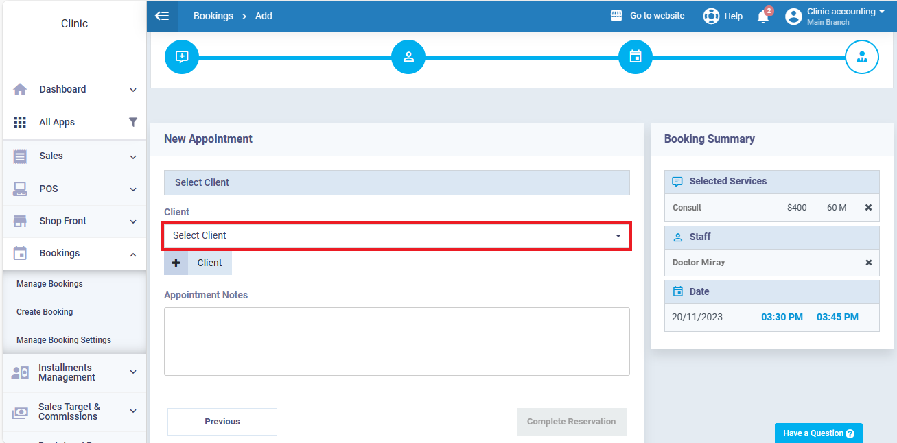 Choose the patient for whom you’re booking the appointment from the dropdown menu under “Select Client” if the patient already exists in the clients.