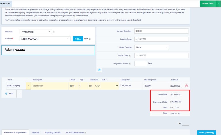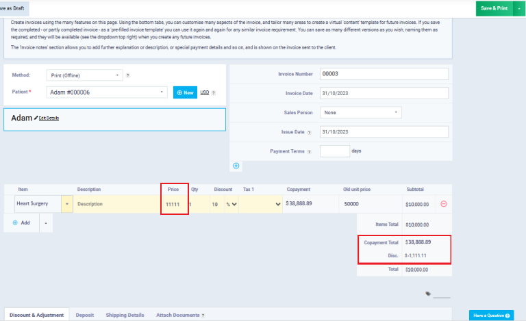 We noticed that the cost borne by the patient is 10,000, which is the maximum co-payment. However, the cost borne by the insurance company is 38,888. Where does this number come from? Let’s first discuss the case from a hypothetical perspective. The system was supposed to load the insurance company with 30,000 and the patient with 20,000 based on the co-payment percentage for each. To avoid exceeding the maximum payment for the patient, the system loaded an additional 10,000 on the insurance company (the value exceeding the maximum payment).