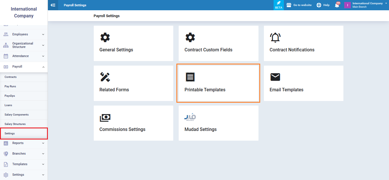 From the main menu, click on “Settings” in the dropdown menu of “Payroll“, then choose the “Printable Templates” tab.