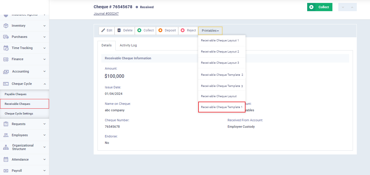 After saving the template, go to “Payable Cheques” or “Receivable Cheques” under “Cheque Cycle” in the main menu, depending on the type of cheque template you modified. Then select the check for which you want to use the template, click on “Printables,” and then select the template name.