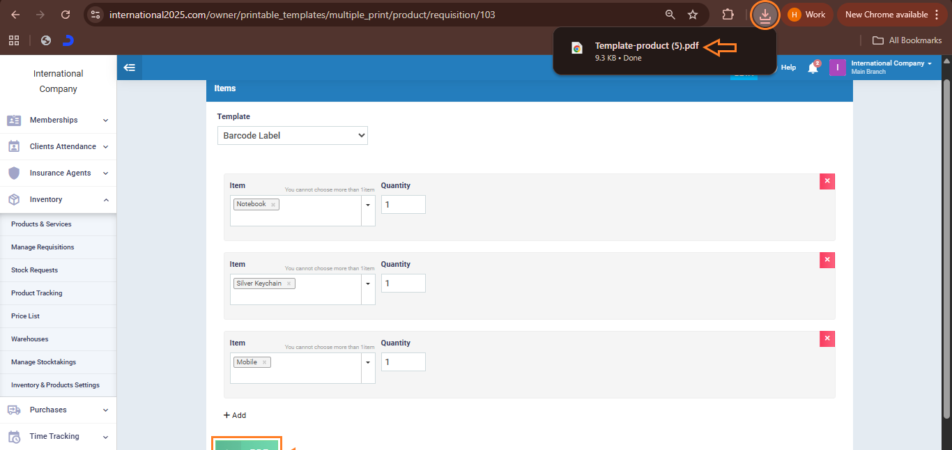 A screen will appear displaying all the products listed within the requisition, as shown in the image. You can specify the quantity of barcodes to be printed for each product individually.