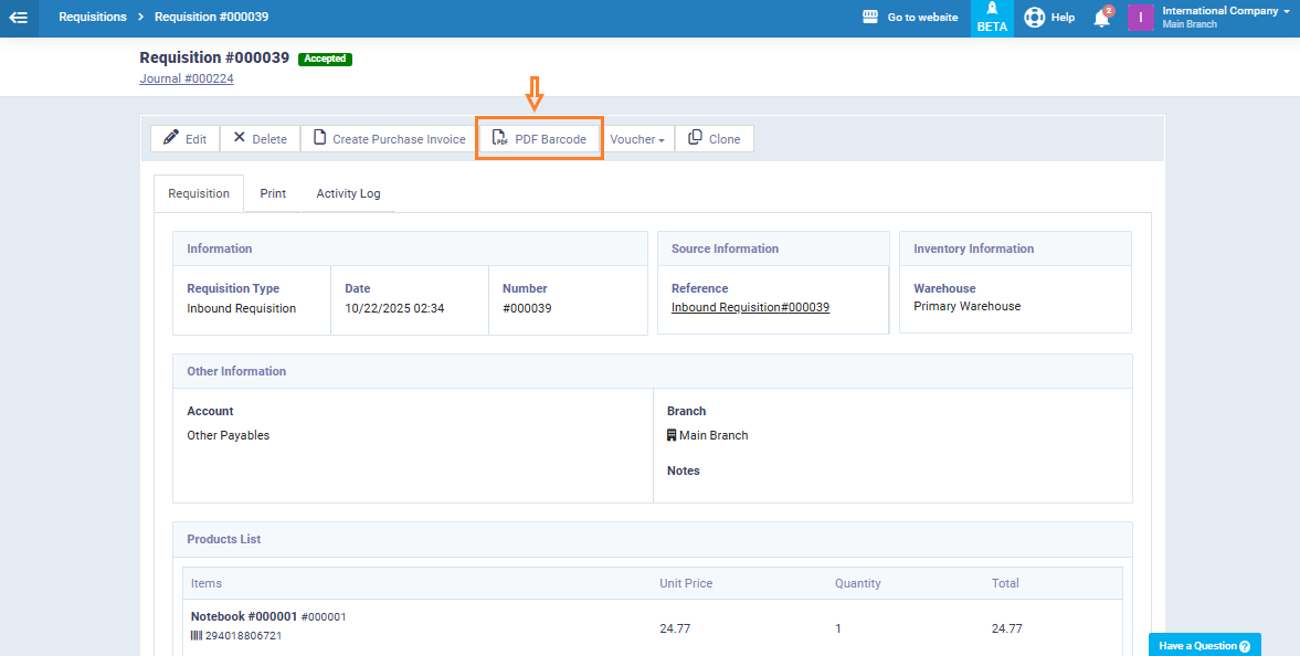 Inside the requisition, click on “PDF Barcode.”
