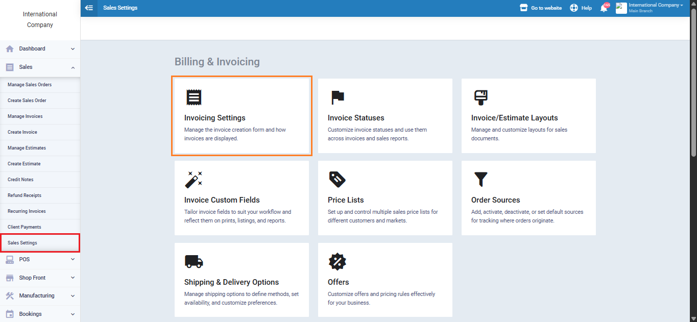 Click on “Sales Settings” under “Sales” in the main menu, then select “Invoice Settings.”