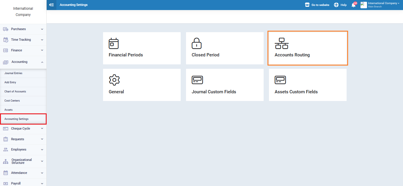 Go to “Accounting”, select “Accounting Settings”. From the settings list, press on “Account Routing”.