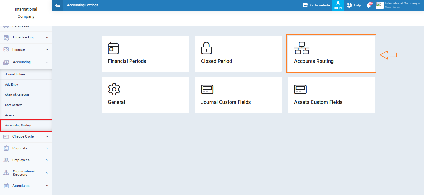 To enable the system to choose another account for routing purchase invoices, first, set up the Purchases Account Routing Settings by clicking on “Accounting Settings” under “Accounting” in the main menu and then click on the “Accounts Routing” card.