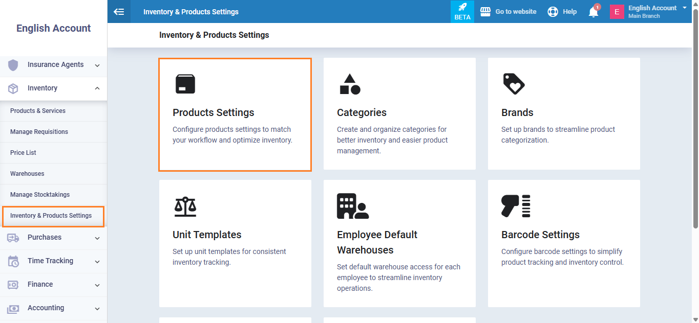 From the main menu click on “Inventory and Products settings” then choose “Products Settings“.