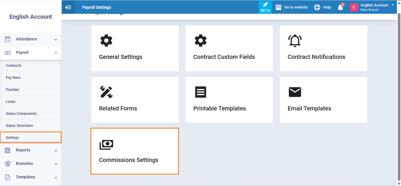 Typically, this option is enabled by default in the account. However, to confirm, go to ‘Payroll‘ in the main menu, then click on ‘Settings,’ and select the ‘Commissions Settings‘ tab as shown in the image: