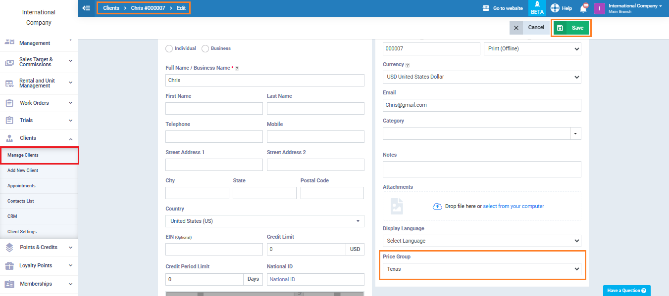 In the “Price Groups” field, select the price list that corresponds to the client’s delivery location. Click “Save.”