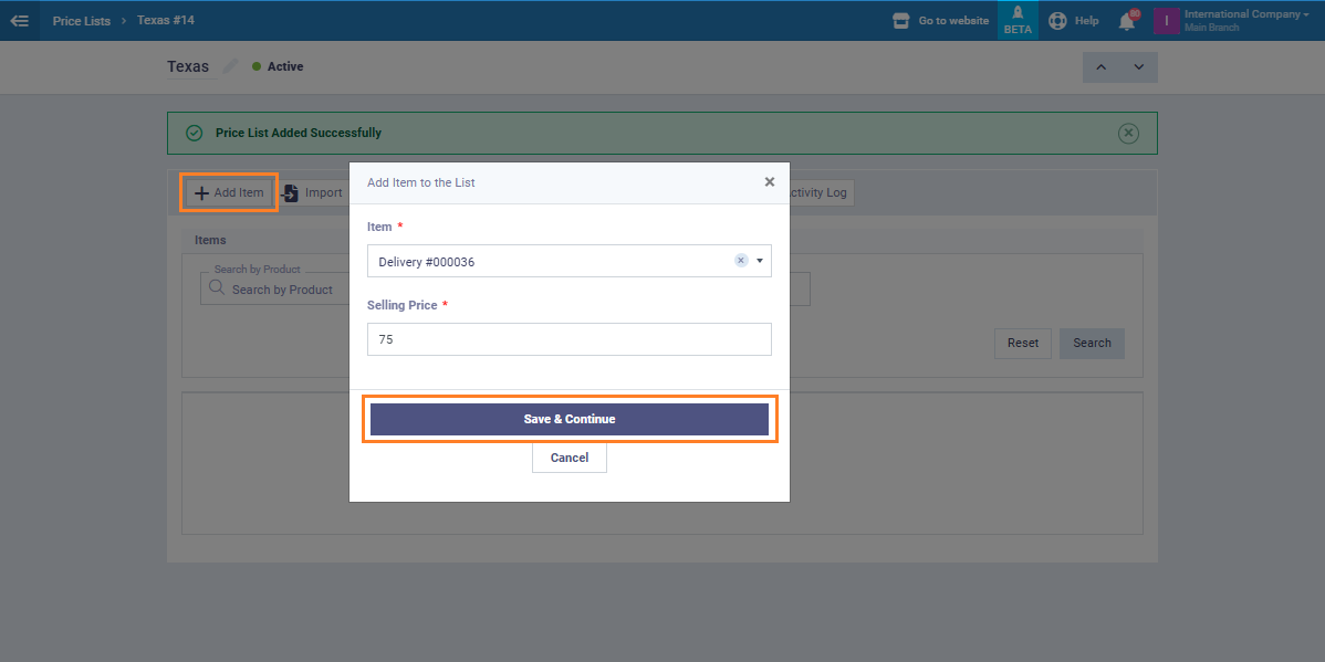 The system will automatically redirect you to the newly created price list page. Click “Add Item.”