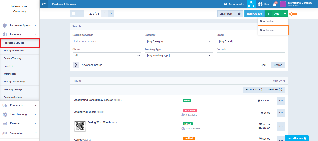 From the main menu, click “Products & Services”, then click “Add” and select “New Service.”