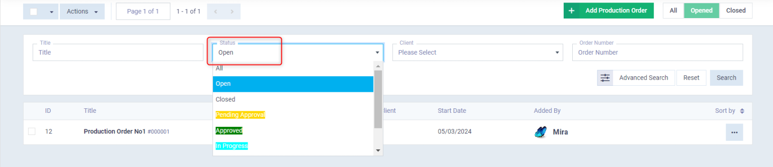 - The status is distinguished by color and controlled in terms of activity; you can use it for searching and filtering