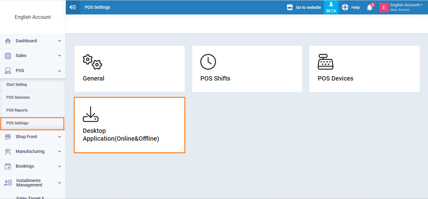 - Click on “POS Settings” in the dropdown menu under the “POS” application on the main menu.