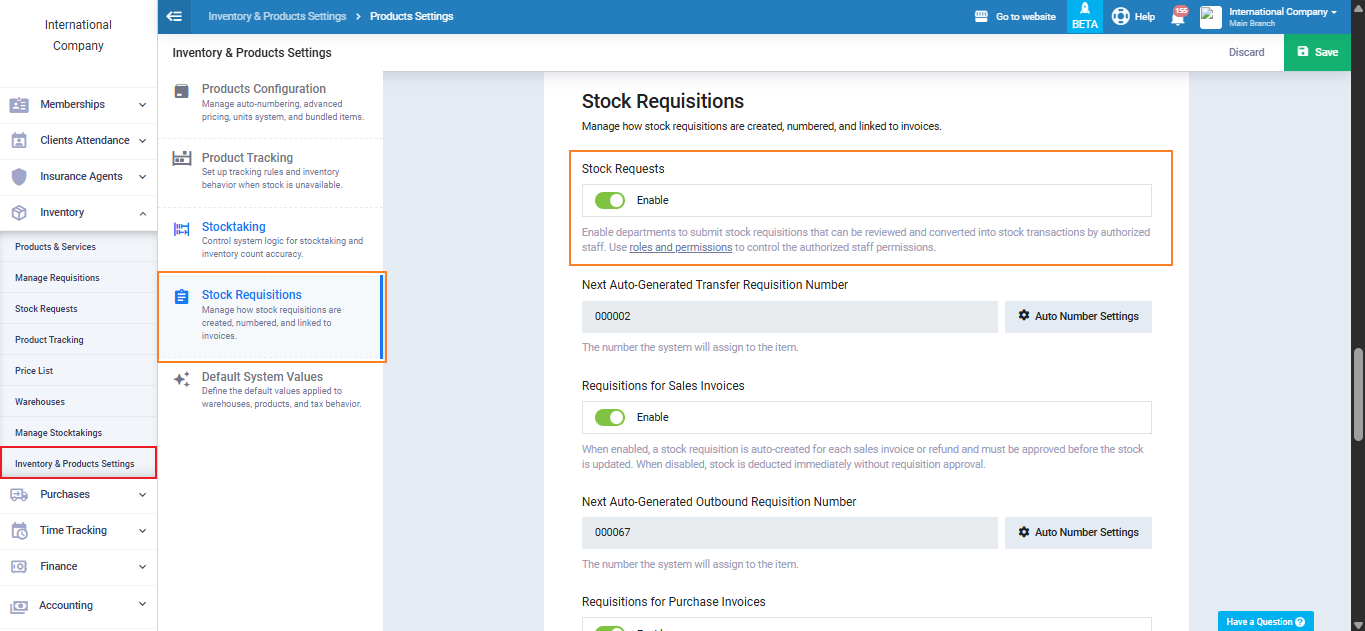 Click on the “Inventory Settings” from the dropdown of “Inventory” in the main menu, then enable the “Stock Requests” setting, and click on the “Save” button.