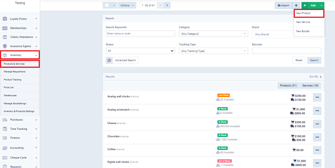 First, go to “Inventory” from the main menu, then select “Products and Services,” press “Add,” and choose “New Product” as illustrated in the image.