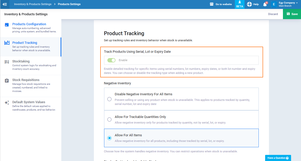 Then click the ‘Save‘ button, and you have successfully activated the option to allow adding products with a tracking system in the invoice.