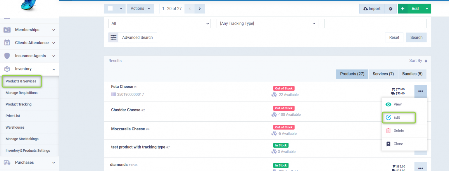 Then click on the “Add” button and select “Product” from the dropdown menu or click on the dots next to the product and press “Edit”.