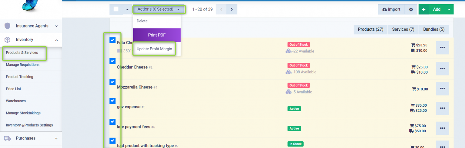 Click on “Products & Services” from the dropdown under “Inventory” in the main menu. Select the products for which you want to update the profit margin by checking the box next to the product name so that a ✅ appears on the selected products. You can select all products by clicking the box next to “Action List” to make a ✅ appear.