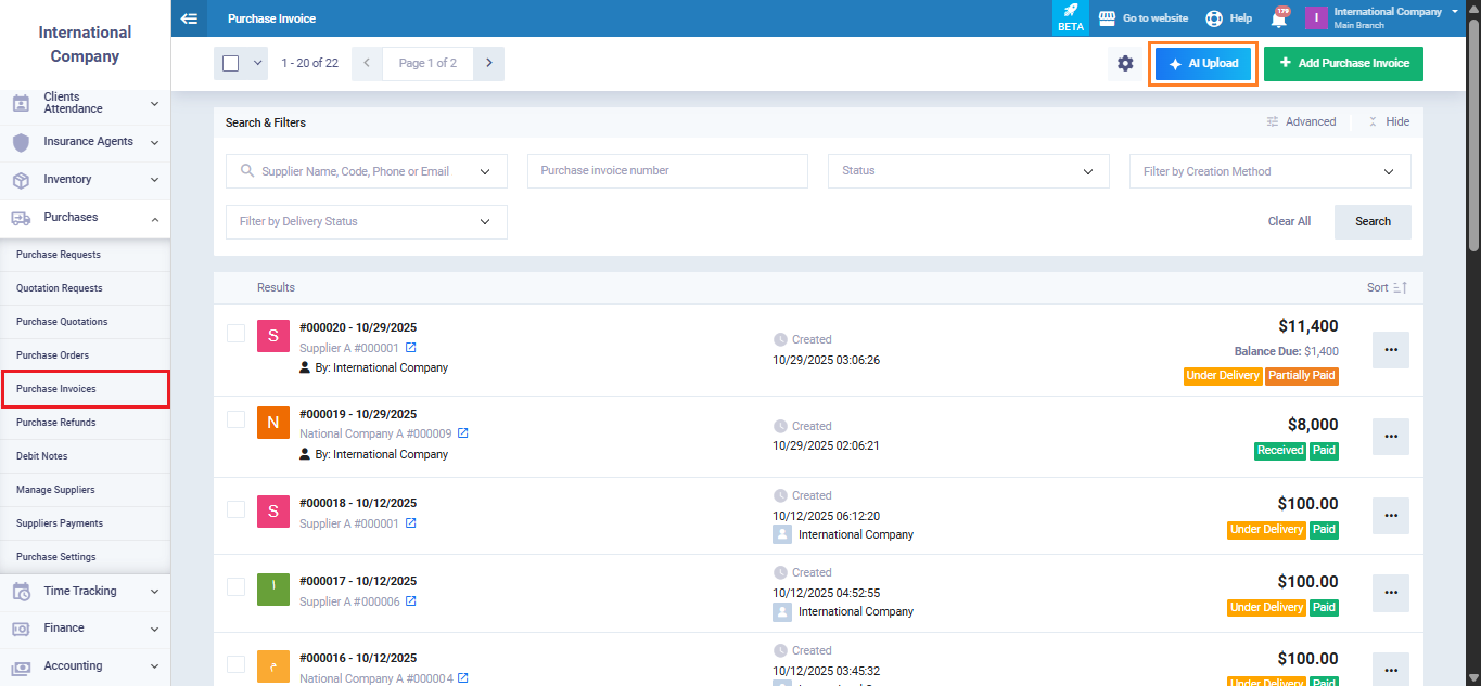 Go to “Purchases Invoices” from the main menu, then click “AI Upload.”