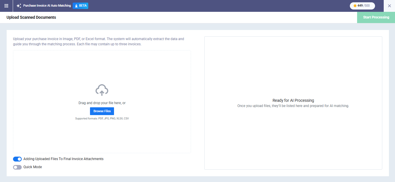 On this screen, the AI begins extracting invoice data from the files sequentially, one after another. Click the “Start Processing” button to begin the process.