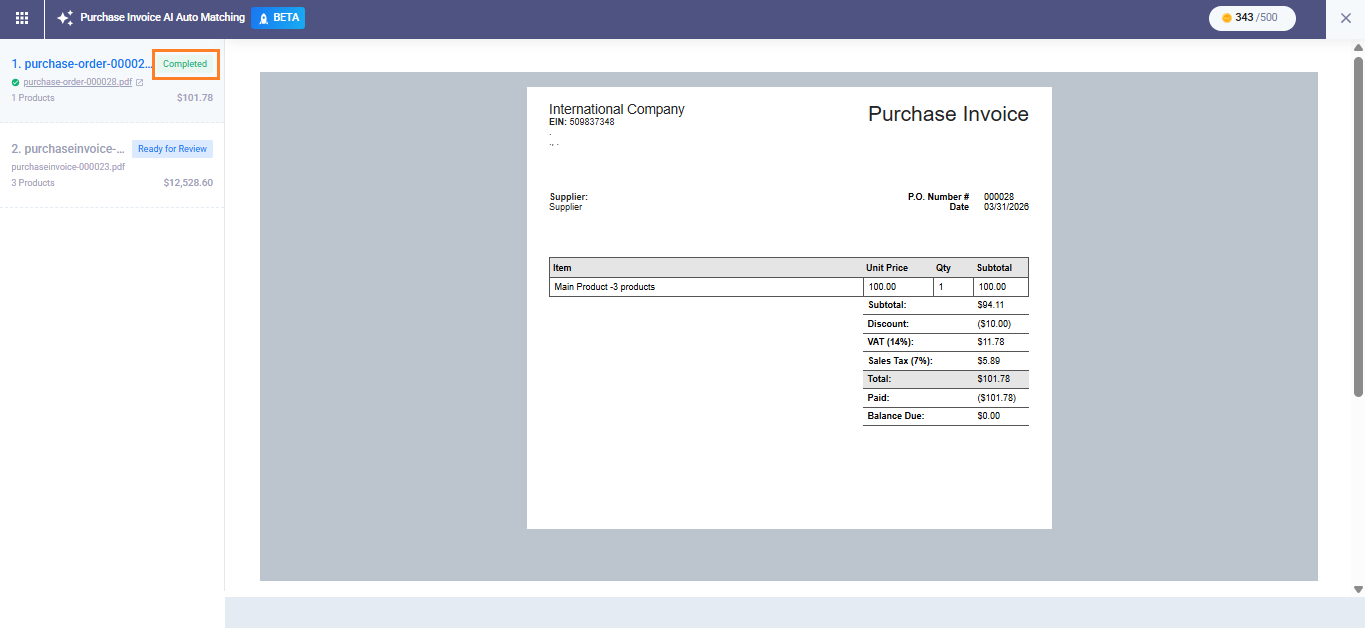 - Completed: The invoice has been reviewed and saved.