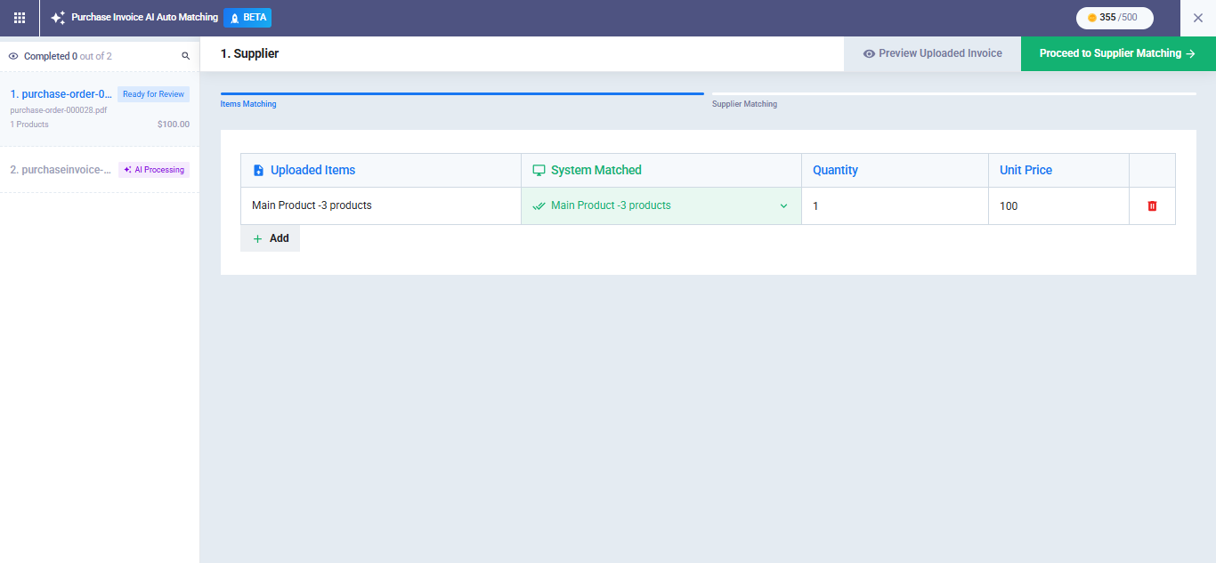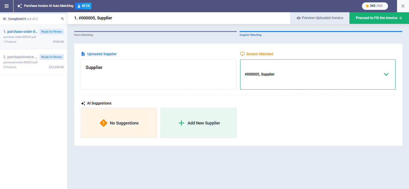 - Matched Supplier: The best match found in your account’s supplier database.