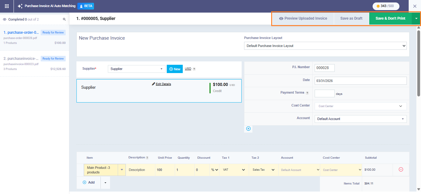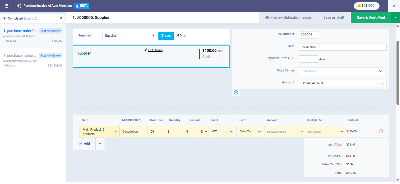 Click “Save & Don’t Print” to officially create the purchase invoice in the system. After saving, the system automatically moves you to the next invoice in the batch, and once the final invoice is saved, you will be redirected to the purchase invoices list.