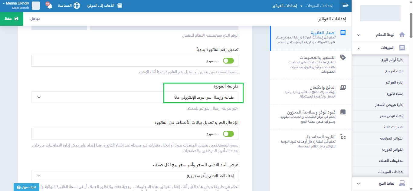 لإظهار هذا الحقل، اضغط على “إعدادات المبيعات” المنسدلة عن “المبيعات” بالقائمة الرئيسية، ثم اضغط على “إعدادات الفواتير” اختر “طباعة وإرسال عبر البريد الإلكتروني معًا” من القائمة المنسدلة عن حقل “طريقة الفوترة” ، ثم اضغط على زر حفظ، ثم اذهب مرة أخرى لإنشاء عميل جديد وفي الأغلب تجد حقل طريقة الفوترة الخاص بالعميل قد ظهر لديك.