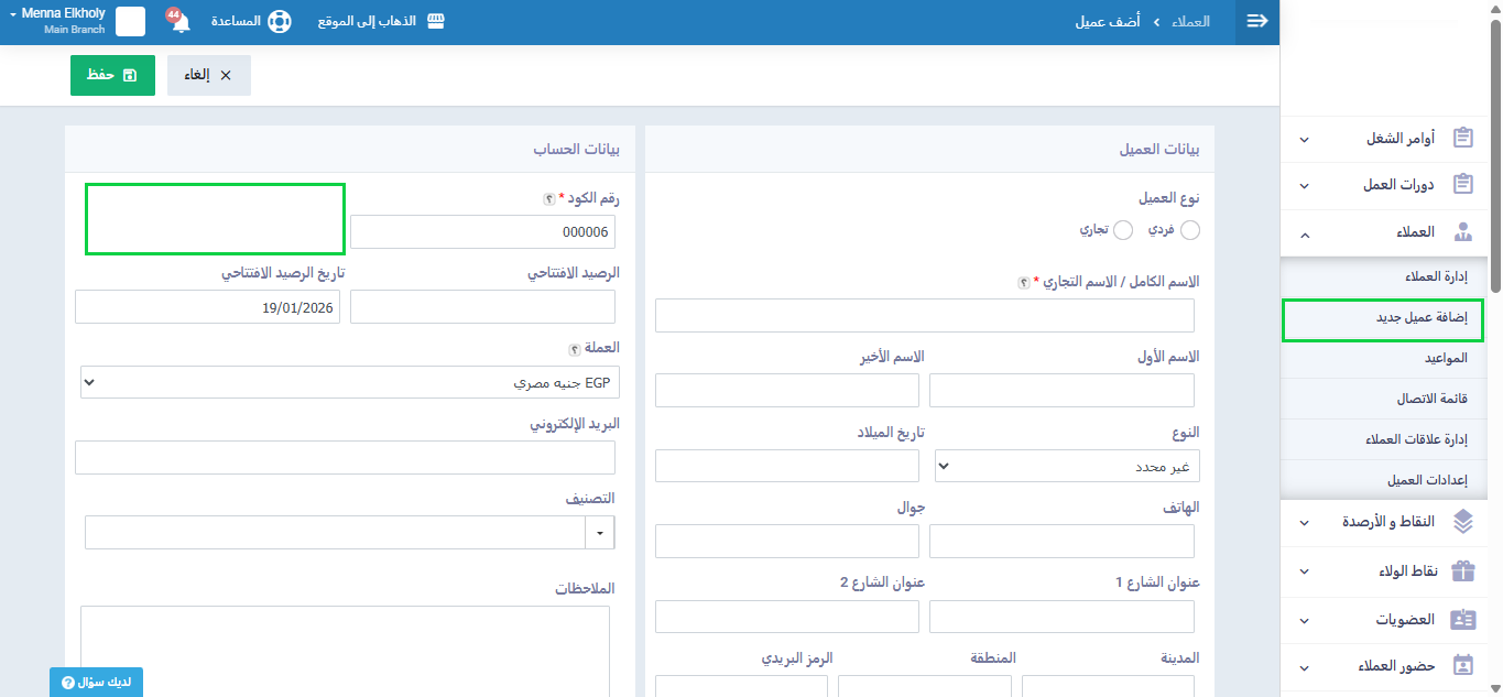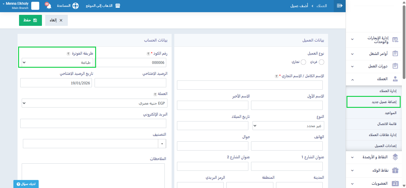 بشكل افتراضي، يظهر لك حقل طريقة الفوترة تلقائيًا عند إضافة عميل جديد، كما هو موضح في الصورة التالية.