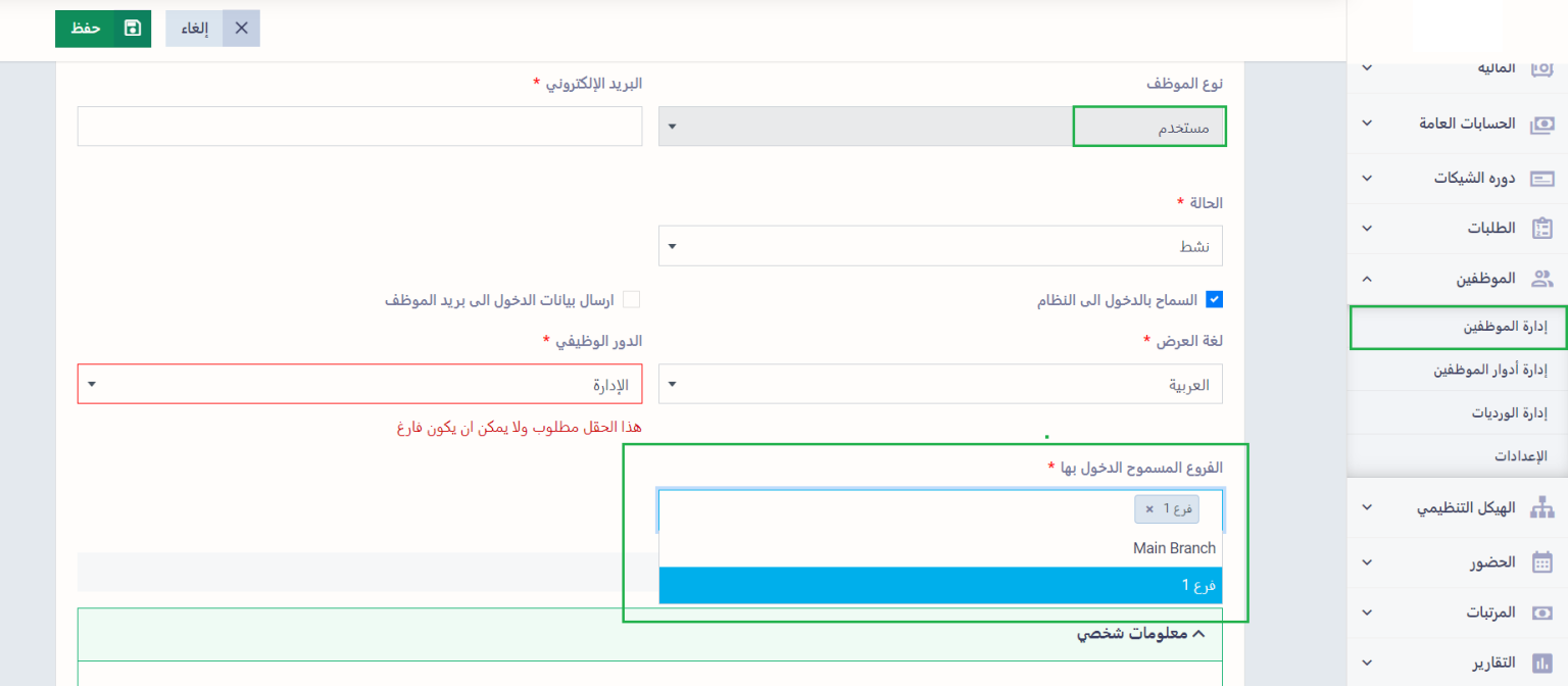 علاوة على إعطاء صلاحيات مخصصة لكل موظف من النوع مستخدم عند الدخول إلى النظام، يمكنك كذلك تحديد الفروع المسموح للمستخدم بالدخول لها وذلك عند إضافة المستخدم، حيث تجد في ملفه الشخصي حقل لاختيار “الفروع المسموحة الدخول بها”. حدد الفرع المراد من القائمة المنسدلة واستكمل بيانات المستخدم ثم اضغط “حفظ”.